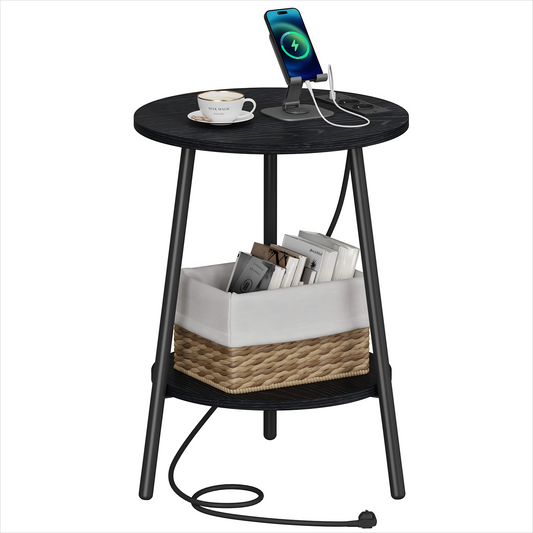 Moderne Ronde Bijzettafel met Oplaadstation & USB-Poorten – Nachtkastje met Opbergbak voor Woonkamer & Slaapkamer