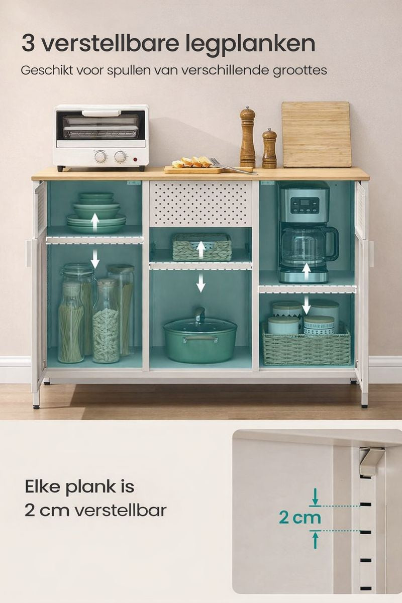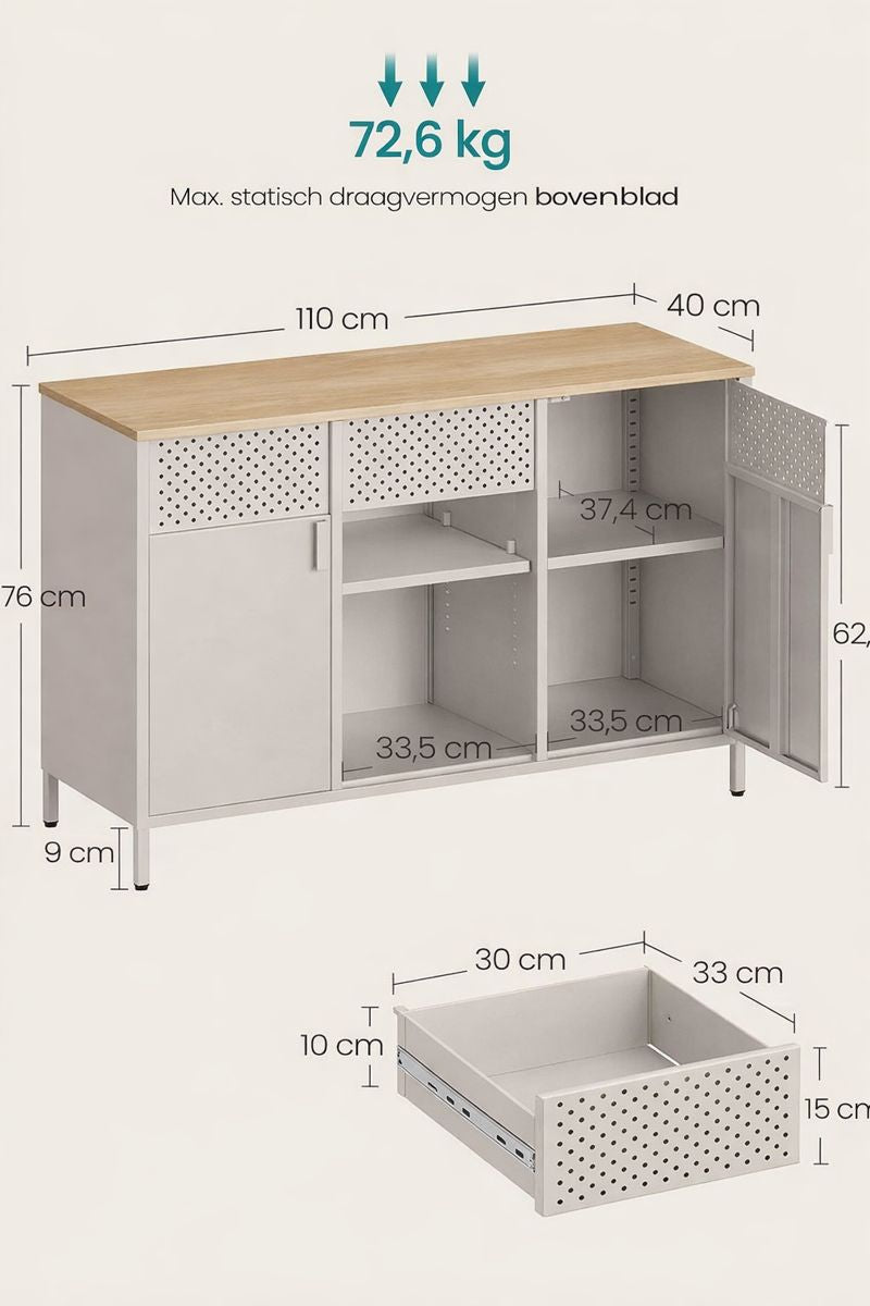 Duurzaam en gemakkelijk schoon te maken: Deze kast van 40 x 110 x 76 cm is gemaakt van hoogwaardige materialen, is duurzaam en heeft een hoog draagvermogen (bovenblad tot 72,6 kg). De stalen kast is vochtbestendig en gemakkelijk schoon te maken.