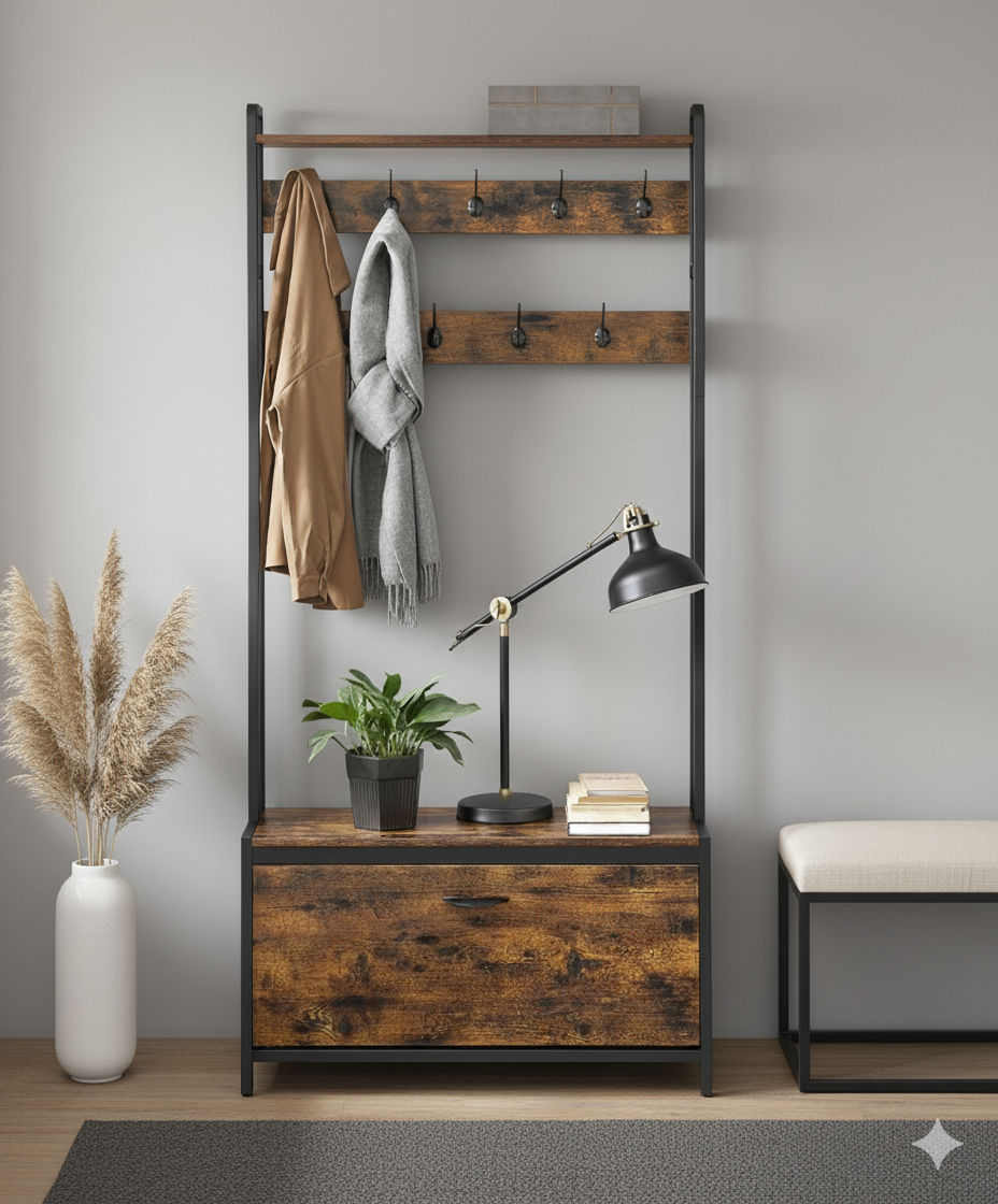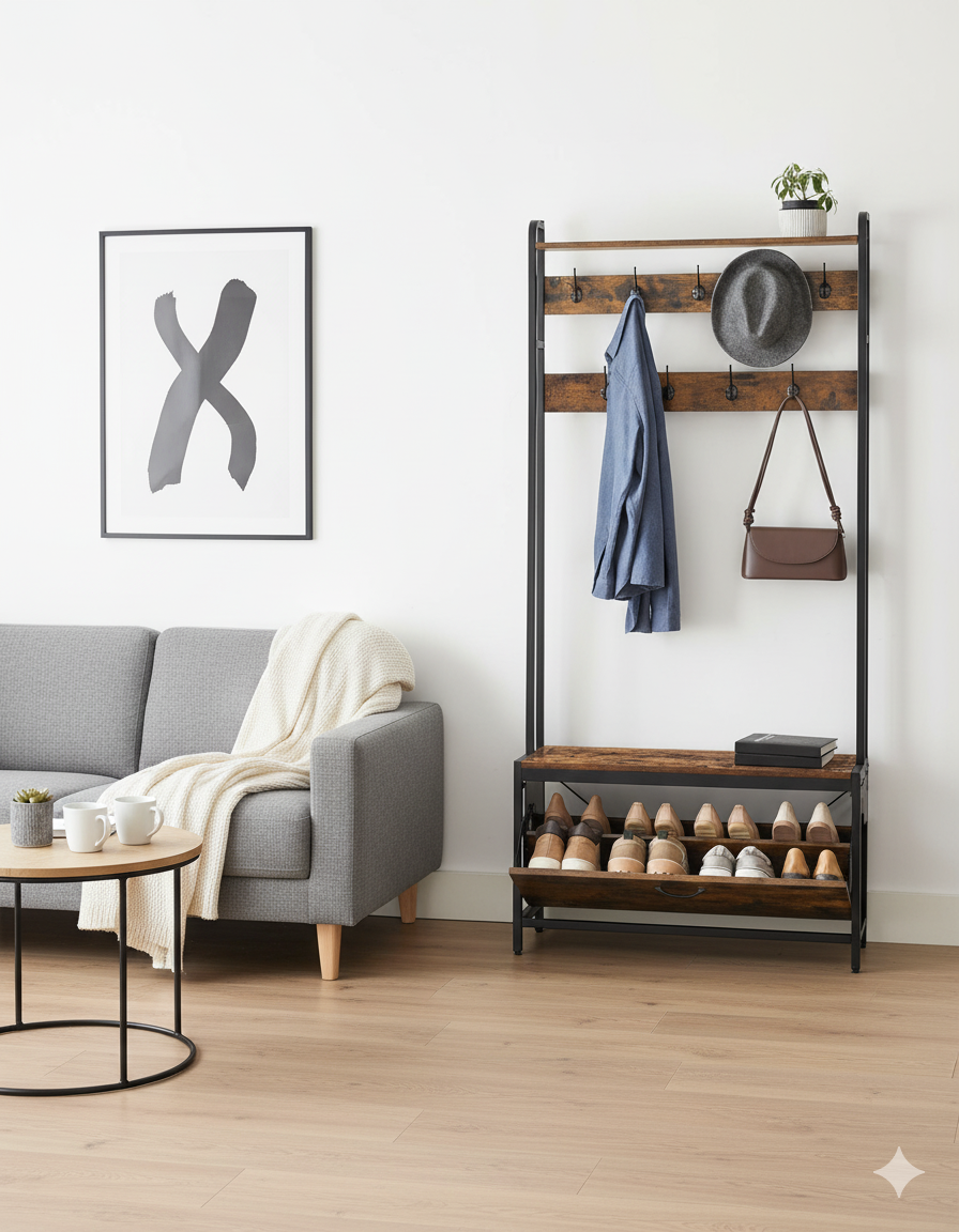 Wat je krijgt: een 4-in-1 kapstok voor de gang die haken, bank, schoenenkast en plank combineert om het meeste uit je gangruimte te halen, en gemakkelijk te volgen instructies en gelabelde onderdelen voor eenvoudige montage.