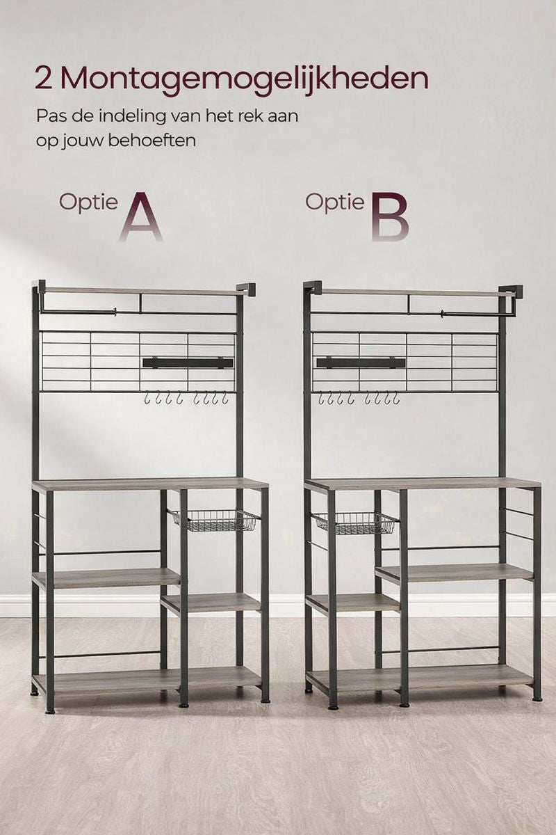 [Veel opbergruimte, diverse opbergmogelijkheden] Bovenste plank voor kruiden, 12 haken voor pannen, spatels of gardes, planken voor koffiezetapparaat, broodrooster en magnetron, enz. – ruim je keuken op zodat je efficiënter kunt koken.