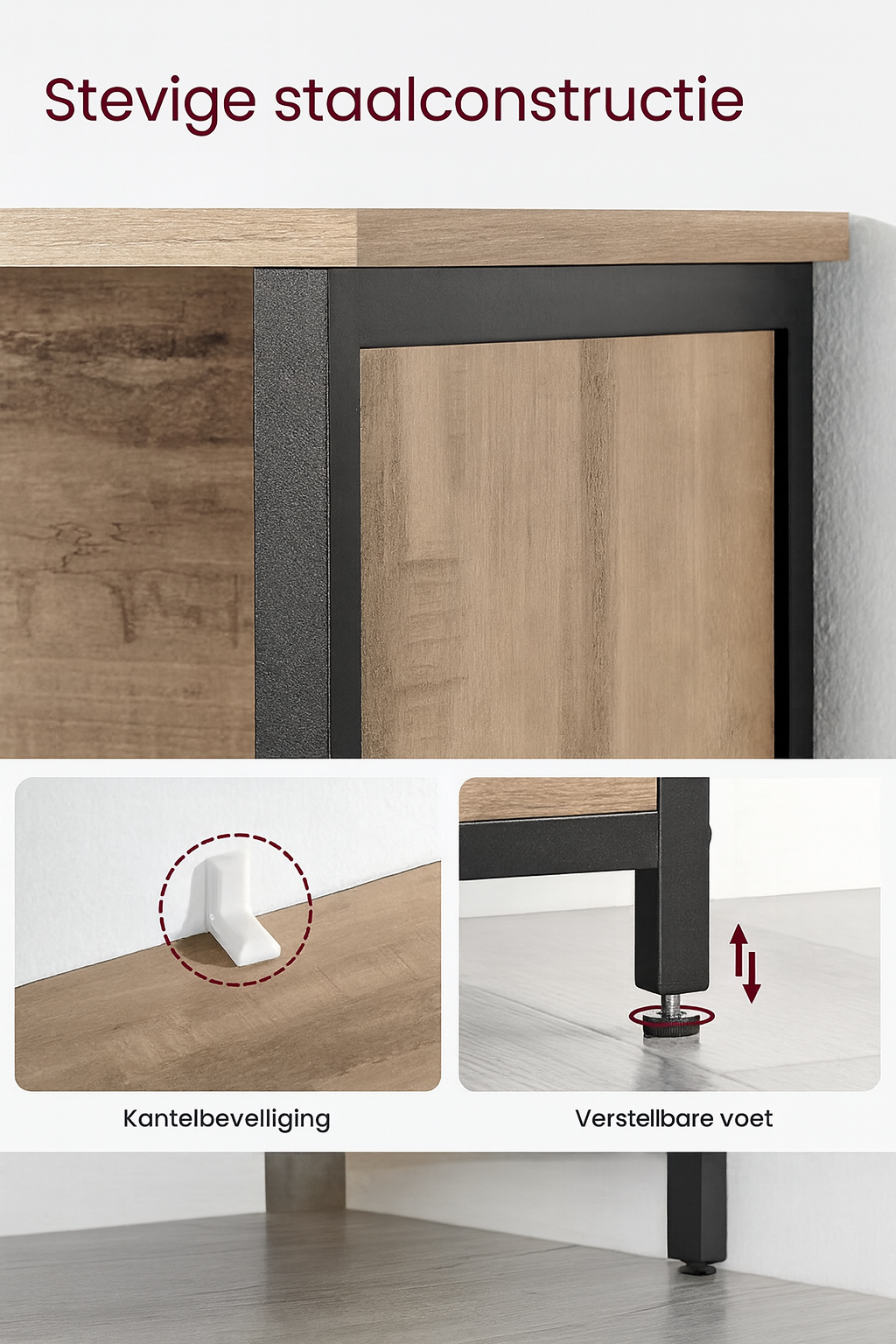 [Stabiel] Het stalen frame is robuust; dankzij de verstelbare poten staat de keukenkast stabiel, zelfs op licht oneffen vloeren; de meegeleverde anti-kantelbeveiliging zorgt voor extra stabiliteit.