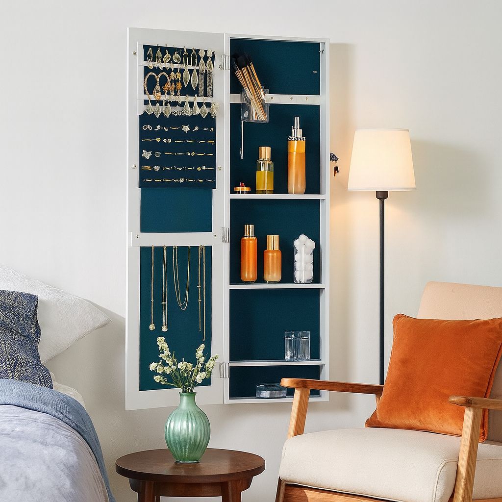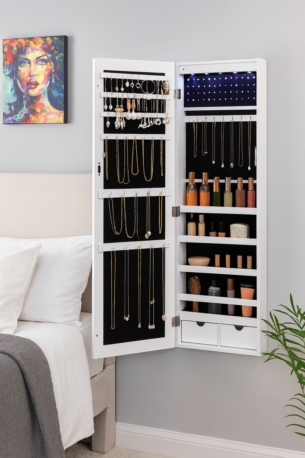 Lecce Spiegelende Sieradenkast met LED-verlichting – Hangend Wandontwerp-Ruimtebesparende Wand-Sieradenkast met Spiegel