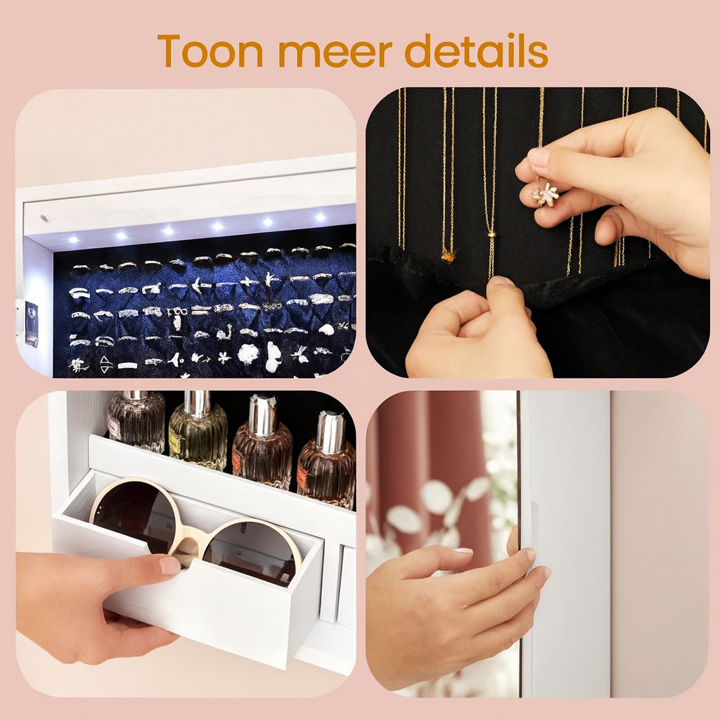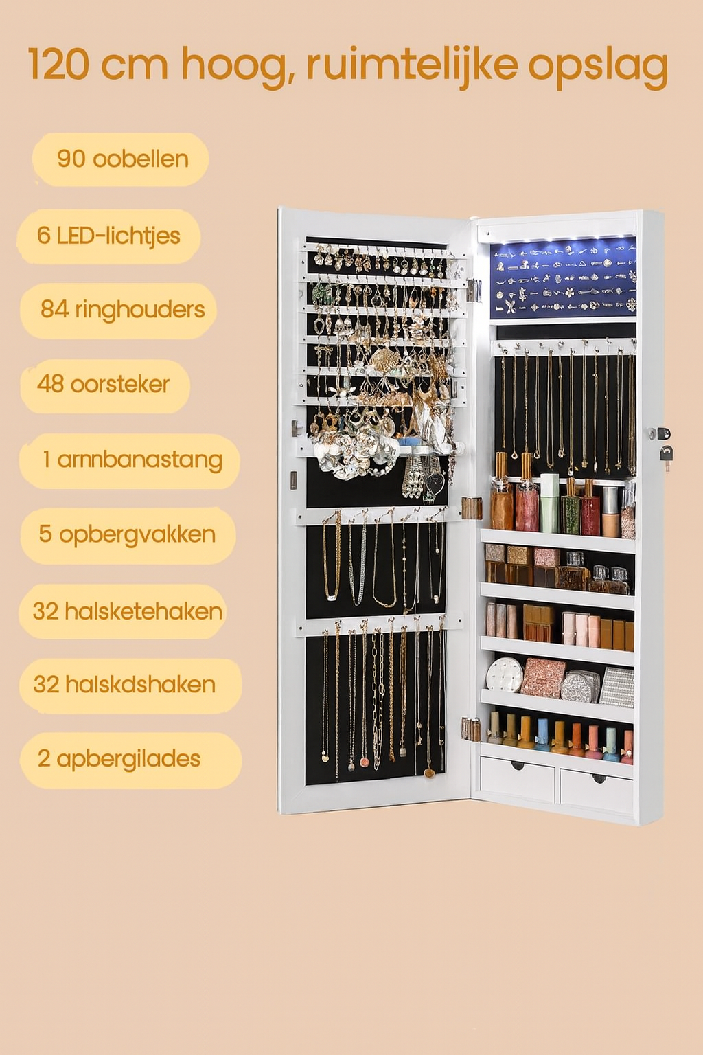 LED-verlichting: 6 LED-lampjes zorgen ervoor dat je sieraden altijd in het beste licht staan; ze gaan automatisch aan en uit wanneer je de deur opent en sluit.
