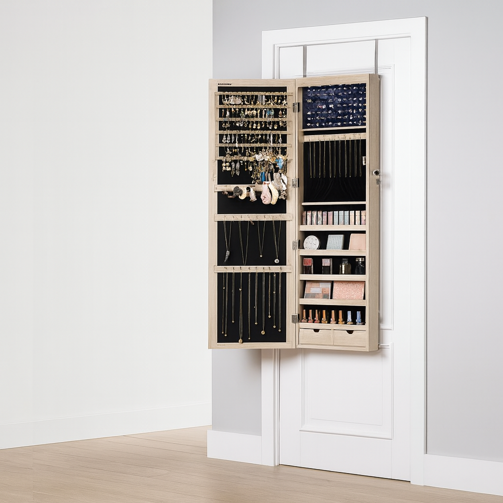 Stijlvol organiseren: Vergeet verloren oorbellen en verwarde kettingen en til je dagelijkse beautyroutine naar een hoger niveau met dit chique sieradenkastje met een glazen spiegel, strakke lijnen en een elegante uitstraling.