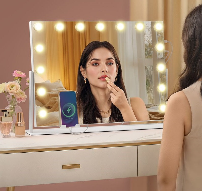 Video's bekijken en opladen: De aan beide zijden gemonteerde telefoonhouder is geschikt voor de meeste telefoons en tablets en stelt u in staat video's te bekijken terwijl u uw make-up aanbrengt. Eén USB-A- en één USB-C-poort voeden uw apparaten terwijl u uw make-up aanbrengt.