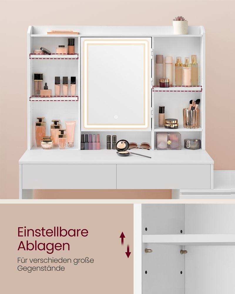 [Veel opbergruimte] Met een bovenste plank, 7 open vakken, 2 grote lades, 2 planken en haken achter de spiegel, en een kast met 4 lades, biedt deze kaptafel voldoende ruimte om al je spullen netjes op te bergen.