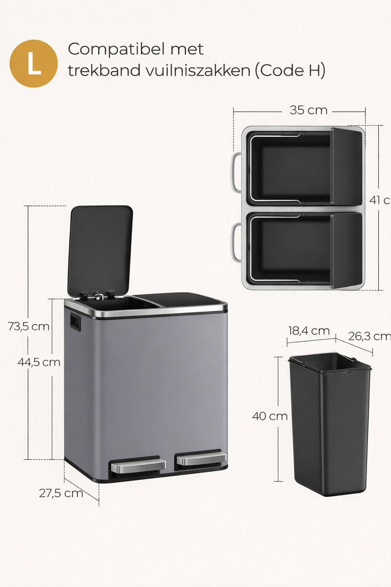 Afmetingen per binnenemmer: 18,4 x 26,3 x 40 cm (L x B x H)