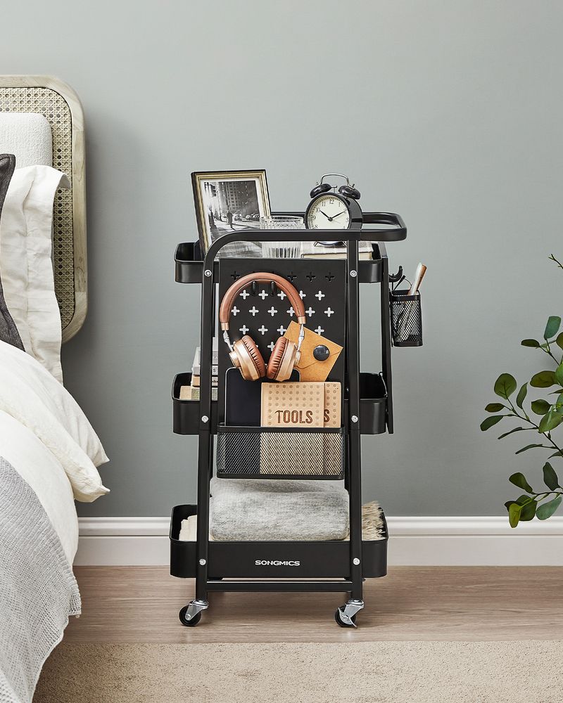 【VERWIJDERBARE KALIUMPANELEN】Twee verwijderbare geperforeerde panelen kunnen aan beide zijden van de rolwagen worden bevestigd. De hangmanden en haken kunnen ook gemakkelijk worden verwijderd en weer aan de geperforeerde panelen worden bevestigd, wat zorgt voor een flexibele opbergoplossing.